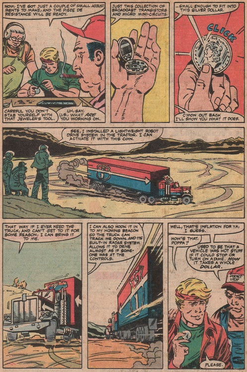 So, working with the local owners of a truck stop… Ok, I’m going to try to write these names without laughing… Poppa Wheelie and Wide Load Anne… ok I failed. Ok, working with those two lugnuts, our hero builds a truck full of missiles, weaponry, insane computer tech, and other James Bondish tricks, he goes one step further. The whole rig is controlled, by a micro-controller hidden in a US silver dollar. I am not joking.