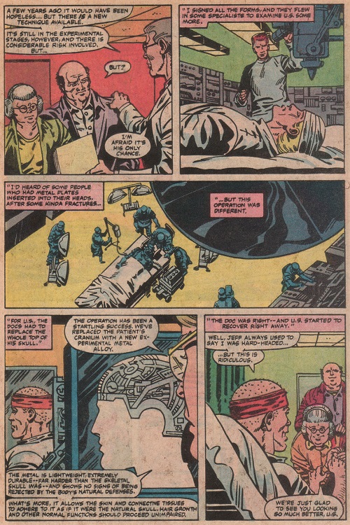 So while driving they get attacked by an evil Truck Driver supervillain...because that’s a thing, and their cab is shoved off the road. Ulysses ends up with a crushed skull and Jeff apparently died in the crash. Of course our hero can’t die and thanks to an experimental surgery, they replace his cranium with a metallic alloy which gifts him with the amazing power of...receiving cb transmissions.