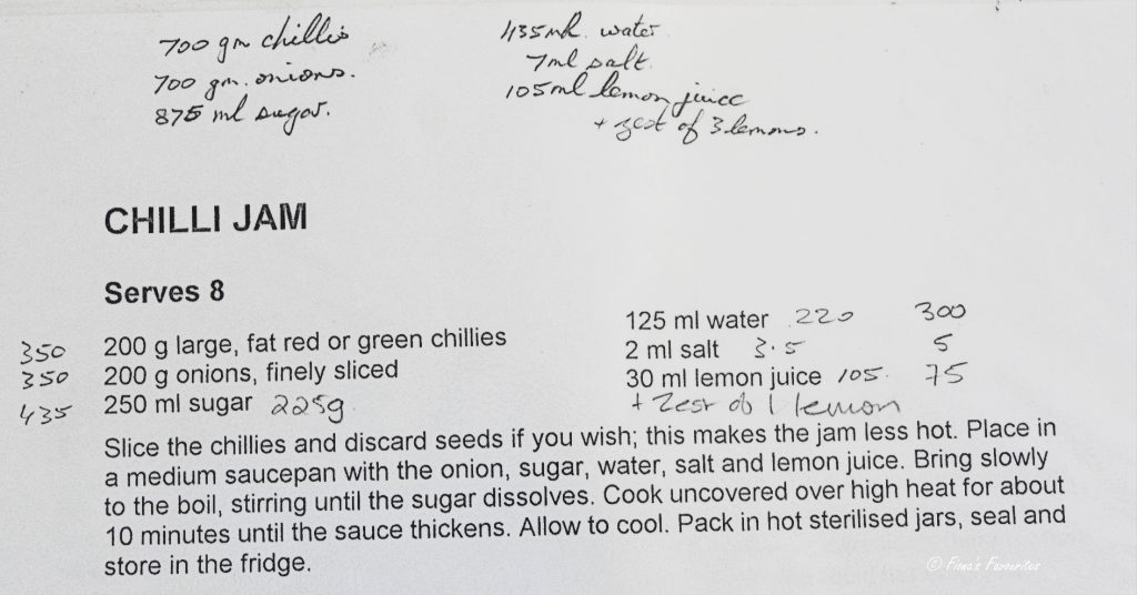 Like a few things I make, my chilli jam is based on a recipe that I’ve had for years, courtesy of Jenny Morris’s newsletter, printed out, filed and consequently spared the devastation of a crashed hard drive. It's worked hard.