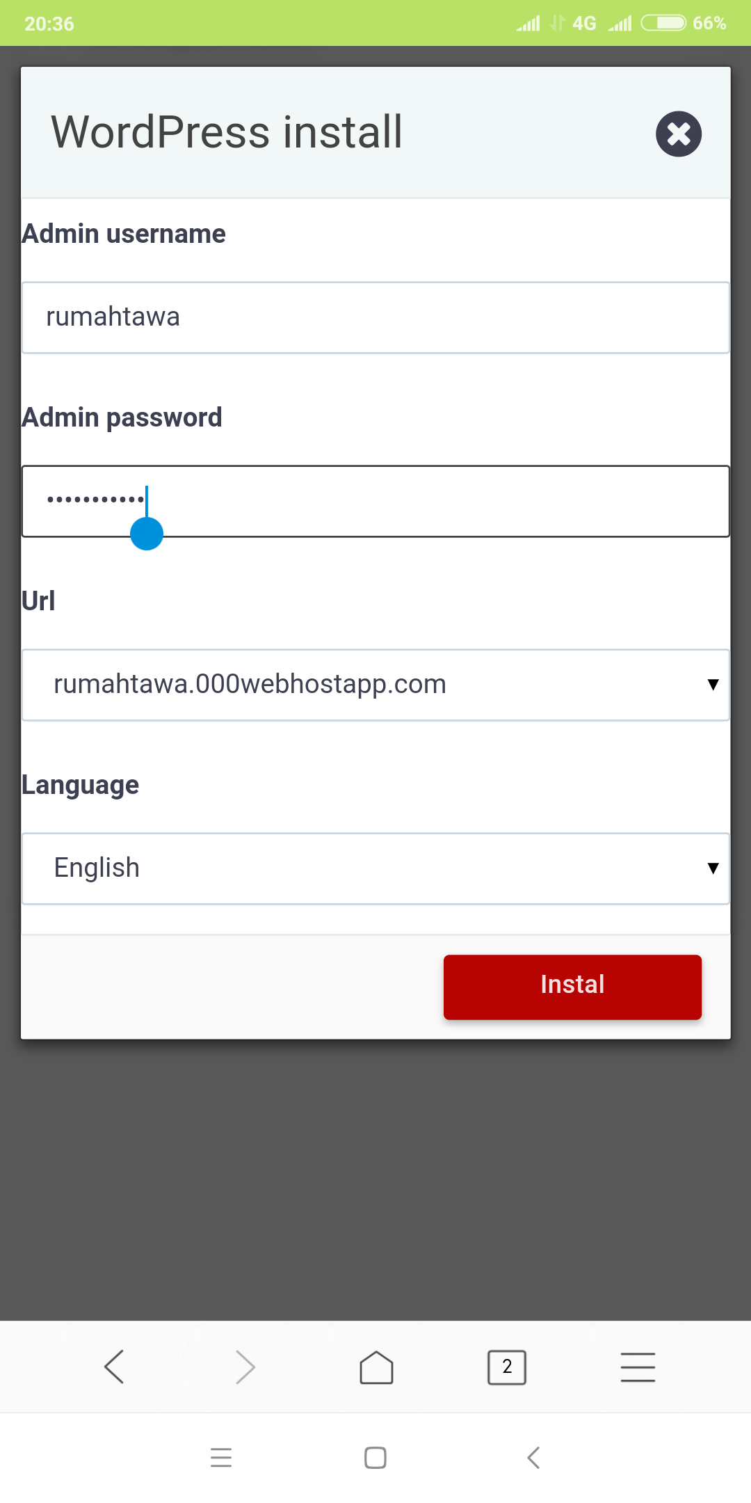 Disitu admin username di isi dengan apa aja yang menurut agan mudah di ingat, jadi itu contoh punya saya, disini hosting milik anda sendiri, jadi andalah yang punya tanah, walaupun tanah gratis. Trus tekan tombol merah, tunggu sampai prosesnya selesai lalu..
