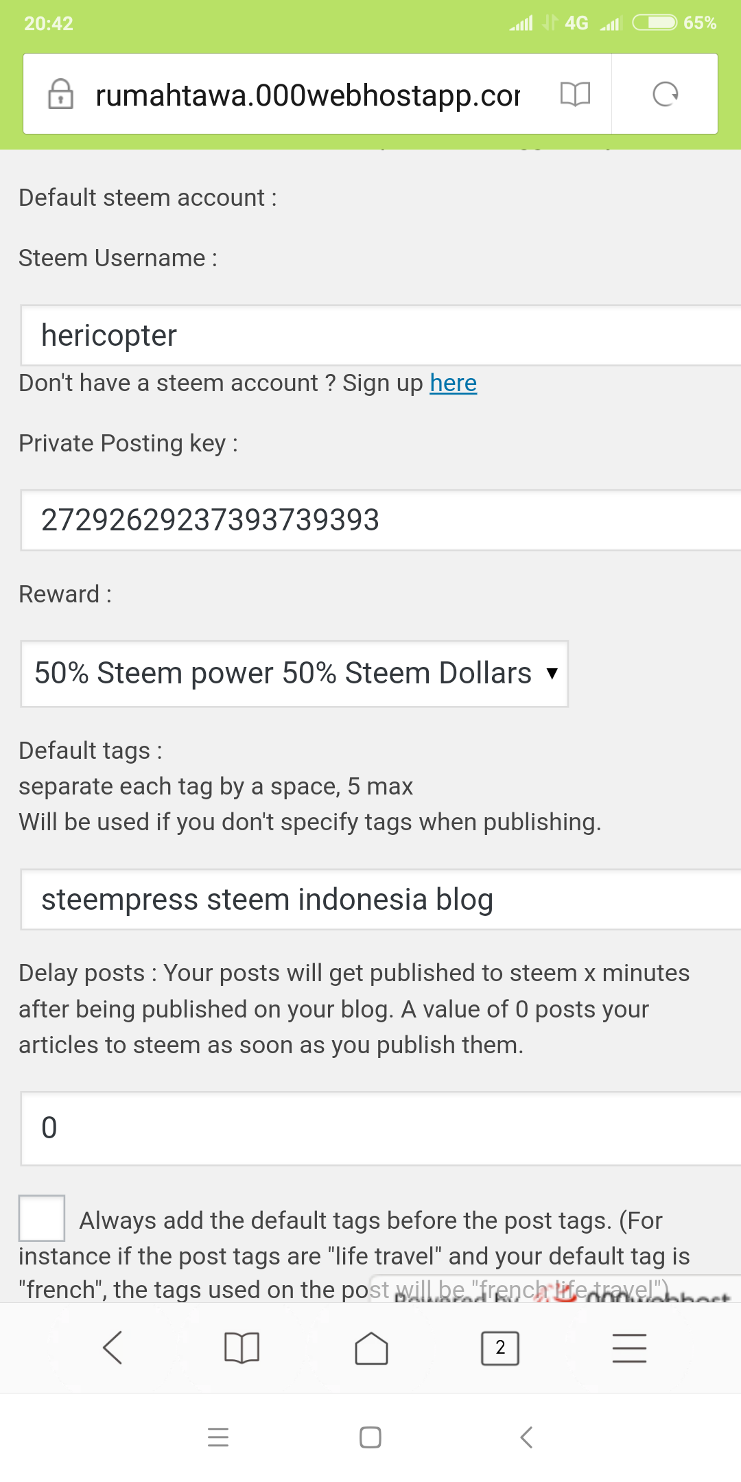 Masukkan username steemit anda, postingkey, trus tag yang akan digunakan, dan berapa menit selisih postingan di blog sama di steemit, disitu anda bisa lihat angka 0, itu bisa diubah, mau selisih 0 menit, 20, 30 atau 1000 tahun (terserah anda). Kalau pingin langsung terposting di steemit, biarkan saja angka 0 itu, jangan di ubah..