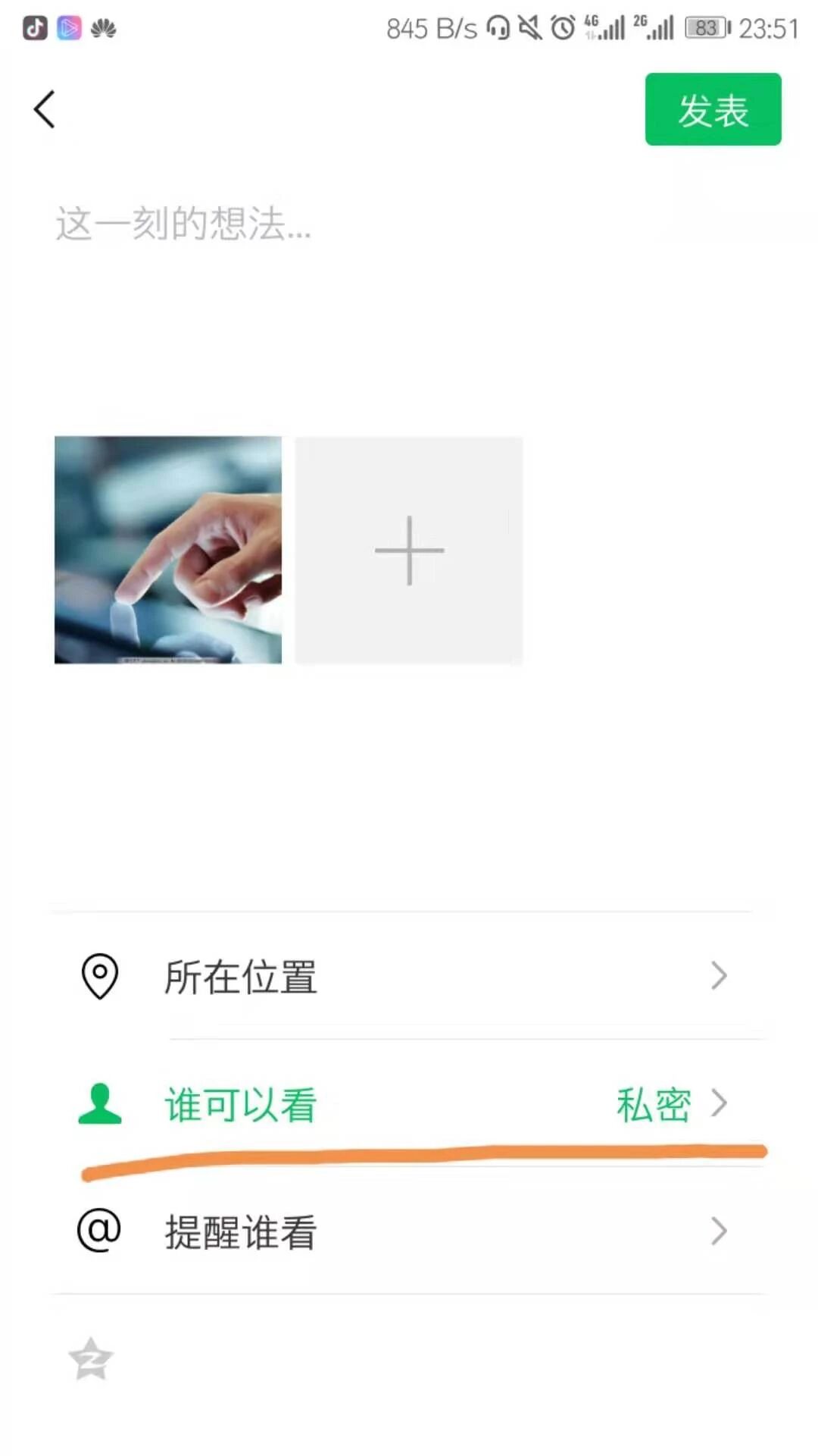 在这里我们可以使用微信的朋友圈功能,将文字,图片、或者简短的视频直接发在朋友圈,要注意的是发成私密视频