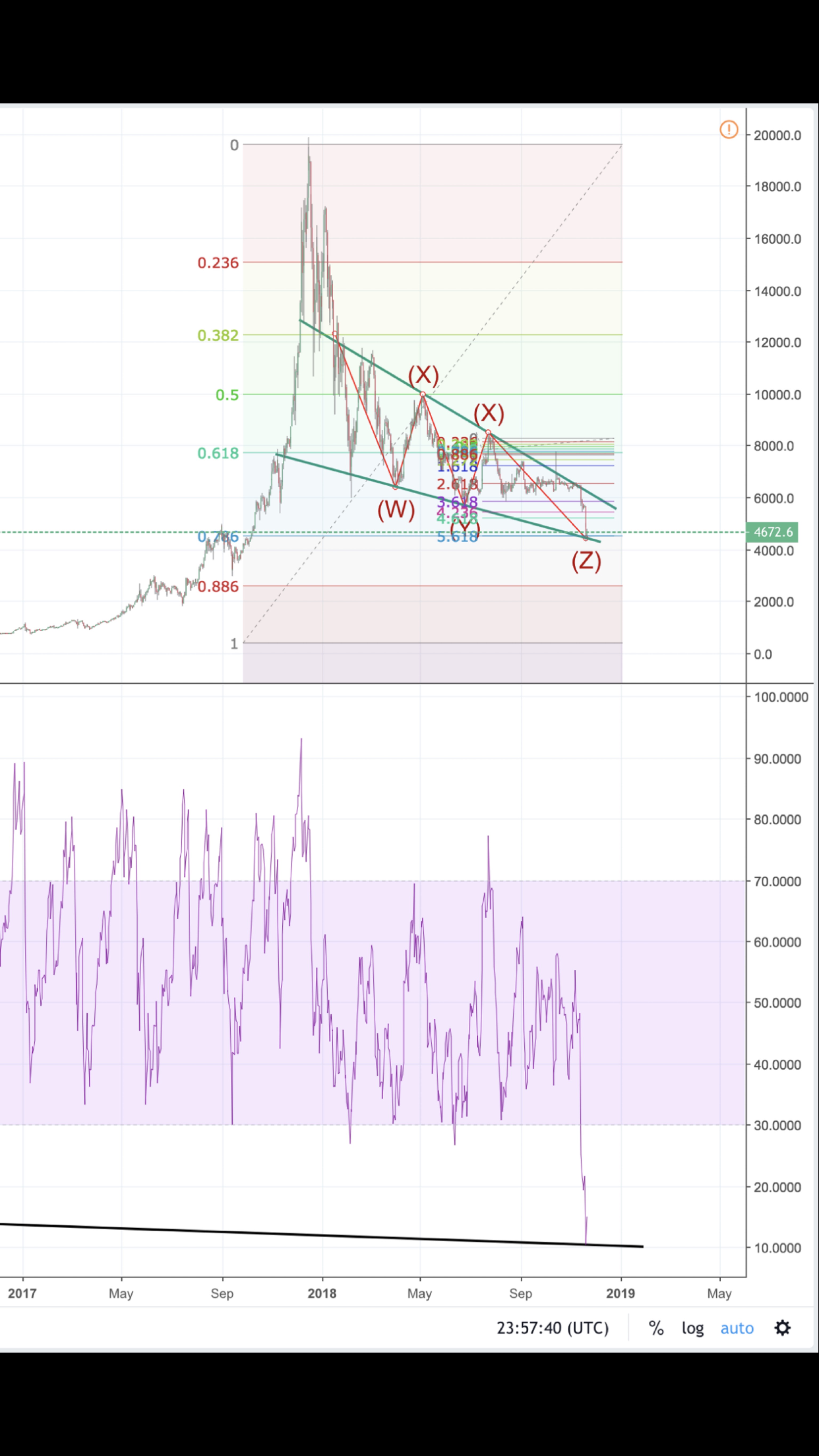 上次既文章同大家分析過$5700呢個位置係決定幣市未來方向既關鍵,而因為早排Bitcoin Cash硬方叉大戰同Bakkt延期呢2個消息既關係不幸地跌破左,幣價跌穿$5,700後失去支持開始free fall,一直跌到而家$4,000美元位置附近先開始見到啲支持。 咁到底之後幣市會何去何從呢?而家又係唔係一個適合既入市時機?我地可以睇下而家個chart係咩樣同RSI呢個技術指標有無啲咩啟示。