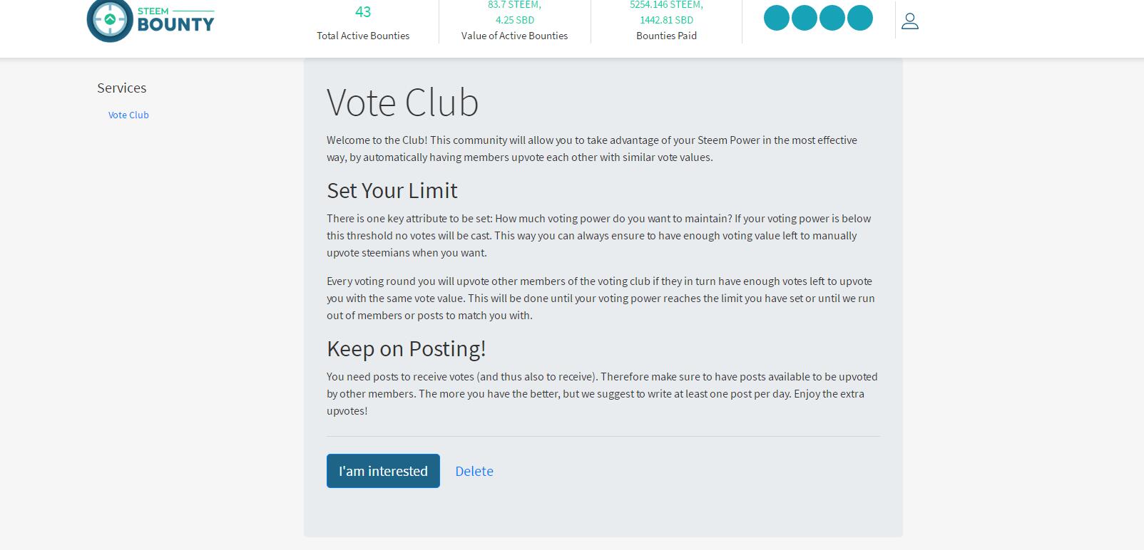 在我刚刚进入steemit时,无意中发现了一个好用的网站,叫投票俱乐部。它是Steem Bounty的一个功能,Steem Bounty是由@knircky开发的一个项目。投票俱乐部是Steem Bounty的一个功能,它的最主要的功能就是交换选票,就是这个俱乐部的成员之间互相投票,你会获得和你投出去的票价值相同的投票。要想使用这个功能,你需要首先在这个网站上注册。https://steem-bounty.com/services?s=vote-club 在你注册完成之后,他会自动帮你投票,直到你的投票能量低于你设定的最小值。在你给别人投票的同时,系统会计算出你的总体的投票价值,安排其他投票俱乐部的会员投给你相同价值的票。这个功能配合SP租赁一起使用我感觉是最好的。