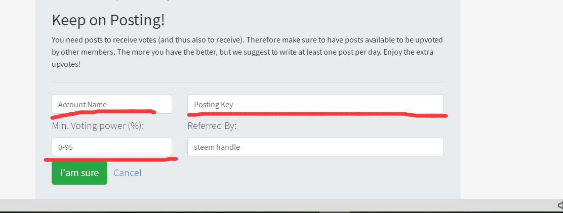 在前两个上面分别填入你的用户名和发帖密码,然后在下面填入你愿意维持的最小的投票能量,当你的投票能量低于你设定的数值时,你就不会在进行投票,同样别人也不会给你投票。最后点击I'am sure就ok啦。