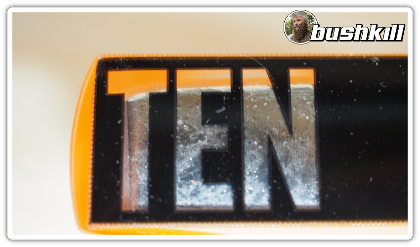 Another neat little "feature" of the packaging is the side has "clear" lettering that identifies the size of the bar. One side says "TEN" and the other "OUNCES" and the actual bar makes the silver pop against the black and orange packaging.