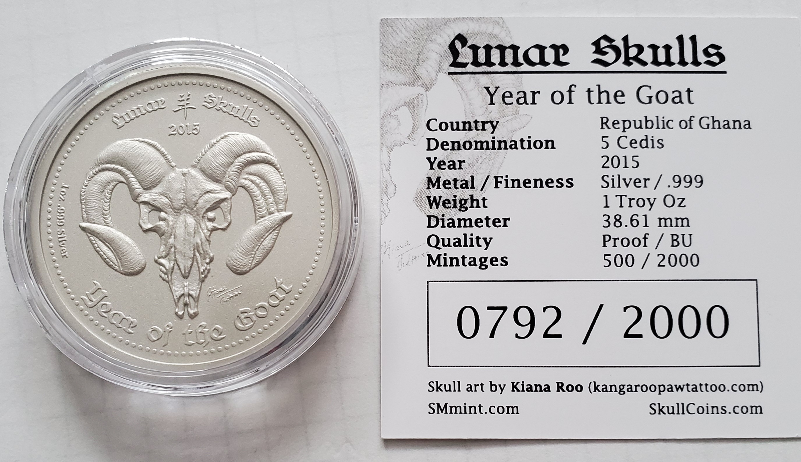 Tonight's coin showcase is this 2015 year of the Goat from Ghana. They're take on the lunar series is to have the animals skull represent the zodiac animal.