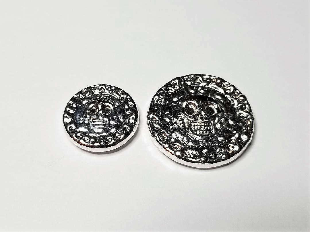 I was explaining to you that @monchhichi23 helps me with my posts. My last #piratesunday post was a 25 gram antiqued dead silver poured button. She really liked it and has been working on her own Silver Treasure Chest. Knowing she wanted one like i had, i came across this pair of silver buttons and thought it would be a perfect present. Since it's Our anniversary I get one and she gets the other one. She will be getting a 25 gram button. I'm not sure if she will like the shinny or antiqued version. I will let her choose the skull💀 button she prefers.