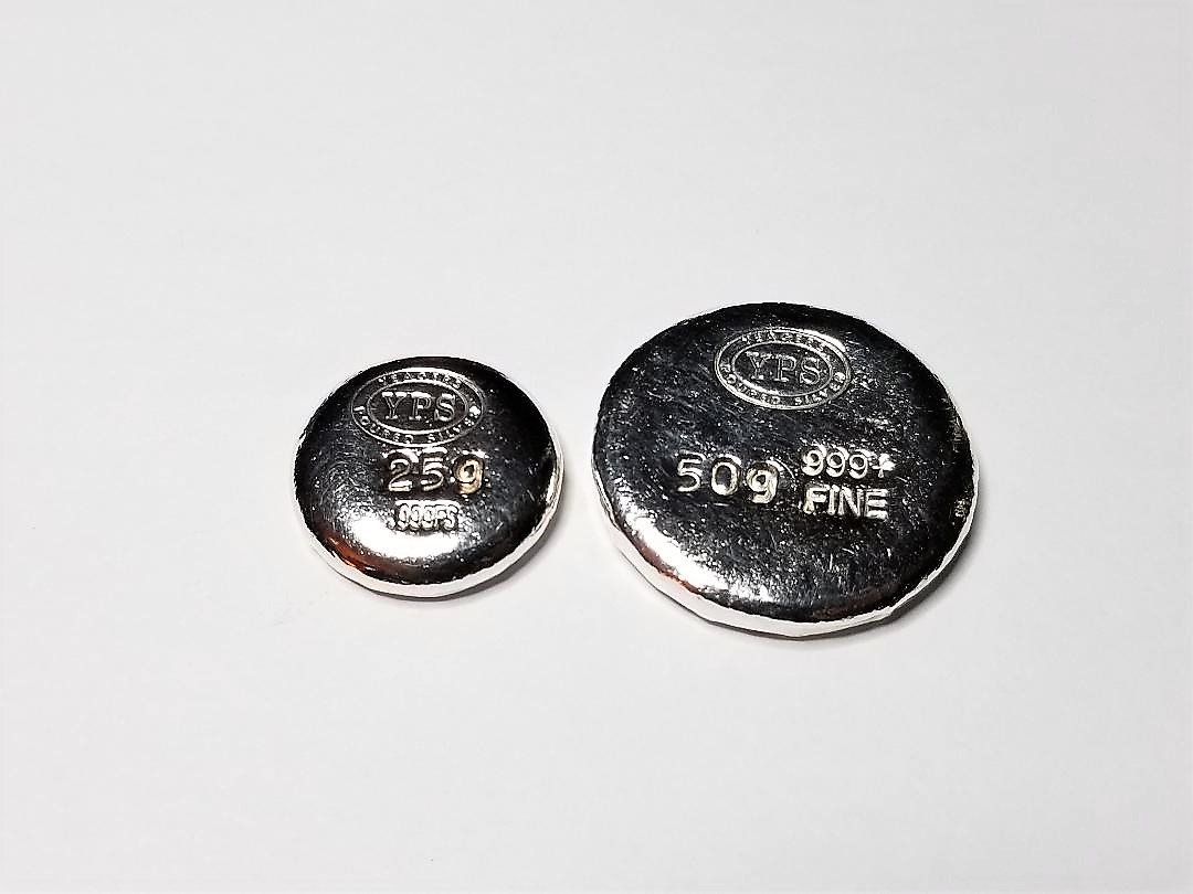 Both silver buttons were made by YPS Yeagers Poured Silver. The only difference is that one is a 50 gram and the other one is a 25 gram.