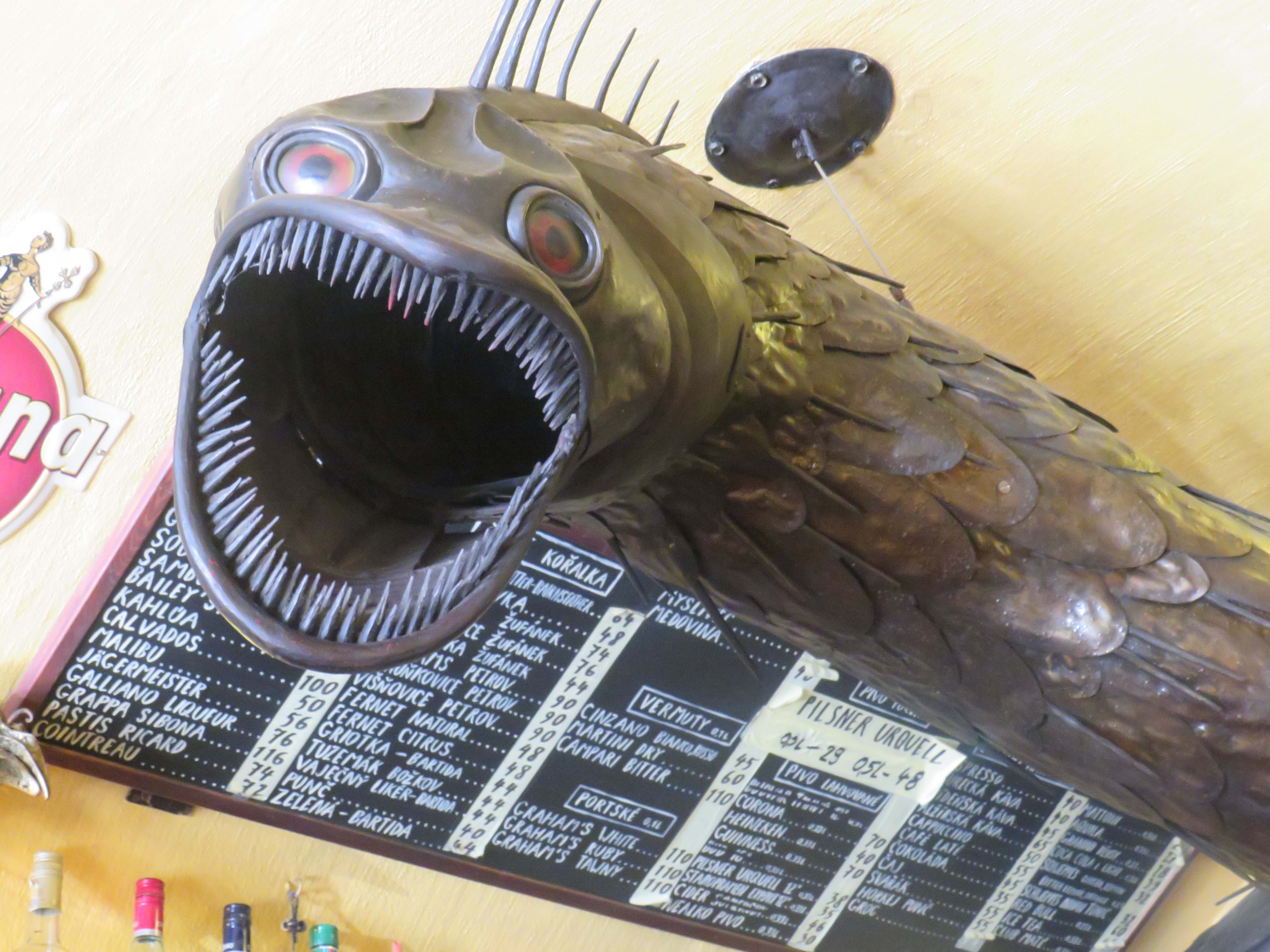 The Czechs seem to love expressing themselves through art and sculpture, for you cultutre vultures there is theatre, live music events and sculptures scattered across the city, i can only think that the years of oppresion has left the Czechs with a deep need to express themselves, even down to a few of the pubs, this one below really caught my eye (actually it was the 40 Kc beer price)
