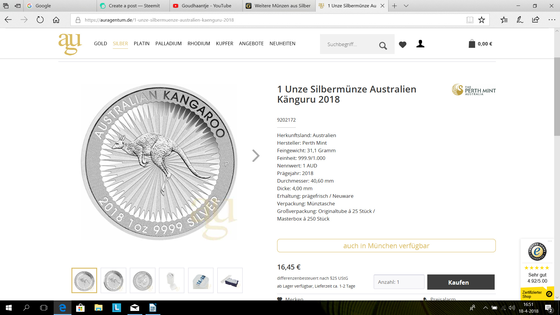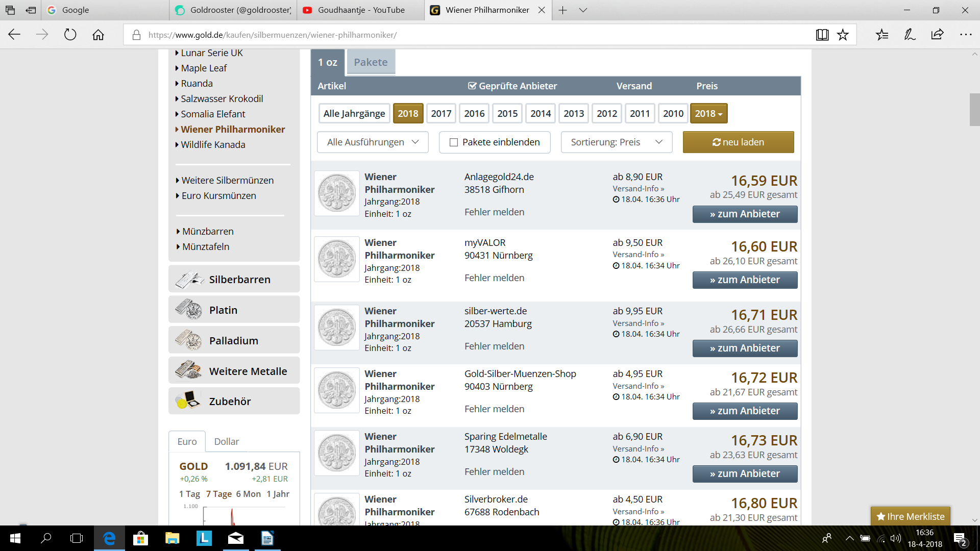On below two screen shots (source gold.de comparison site) you see the Philharmoniker prices at various German dealers and further below the same for the American Silver Eagle (A.S.E.) .