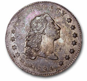 “Some of the new dollars now coming at the Mint of the United States have found their way into this town. A correspondent put one into the editor’s hands yesterday. Its weight is equal to that of a Spanish dollar, but the metal appears finer. One side bears a head, with flowing tresses, encircled by Fifteen stars and has the word “LIBERTY” at the top, and the date, 1794, at the bottom. On the reverse, is a Bald Eagle, enclosed in an Olive Branch, round which are the words “One Dollar, or Unit, Hundred Cents.” The tout ensemble has a pleasing effect to a connoisseur; but the touches the graver are too delicate, and there is a want of that boldness of execution which is necessary to durability and currency.” Source