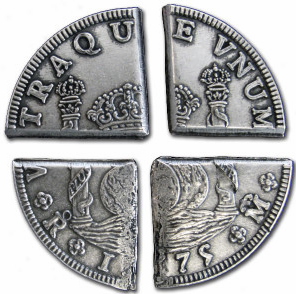 The "quarters" were also cut into "8ths" which is were we get idea of the "Piece of eight". They were also called bits. So a shave and a haircut cost $0.25