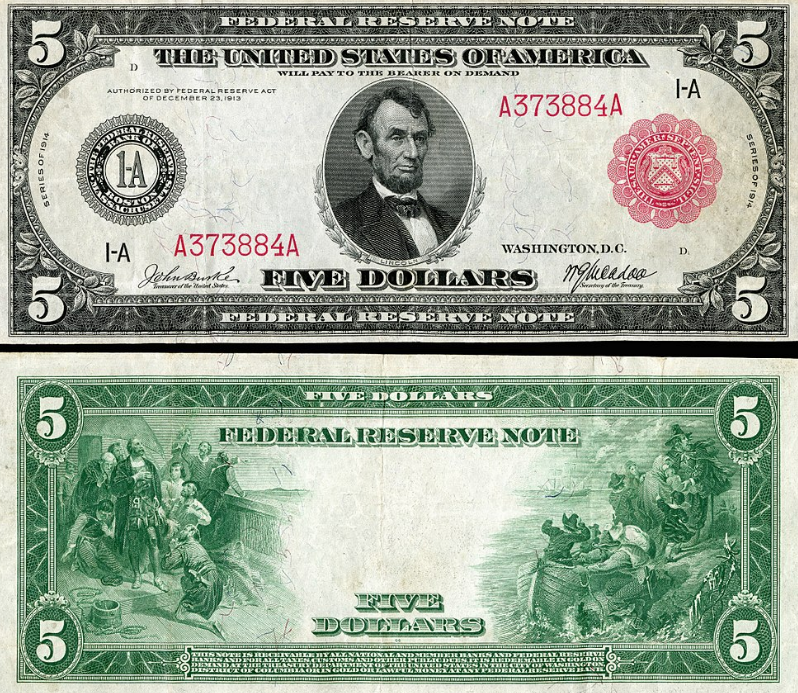 Shortly after the Federal Reserve Act of 1913, the first Federal Reserve Notes began being printed. This is a $5 Federal Reserve Note from 1914.