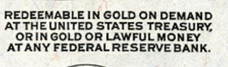 "This note is receivable by all national and member banks and Federal Reserve Banks and for all taxes, customs and other public dues. It is redeemable in gold on demand at the Treasury Department of the United States in the city of Washington, District of Columbia or in gold or lawful money at any Federal Reserve Bank."