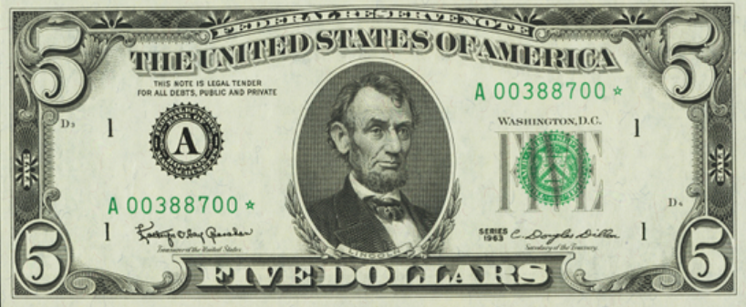 Federal Reserve Notes, which were redeemable for lawful money, come 1963, simply are not anymore. The bearer of this note will no longer be paid five dollars of lawful money on demand. We must treat this "note" as if it was five dollars! Even if it's NOT lawful money, it's "legal tender".