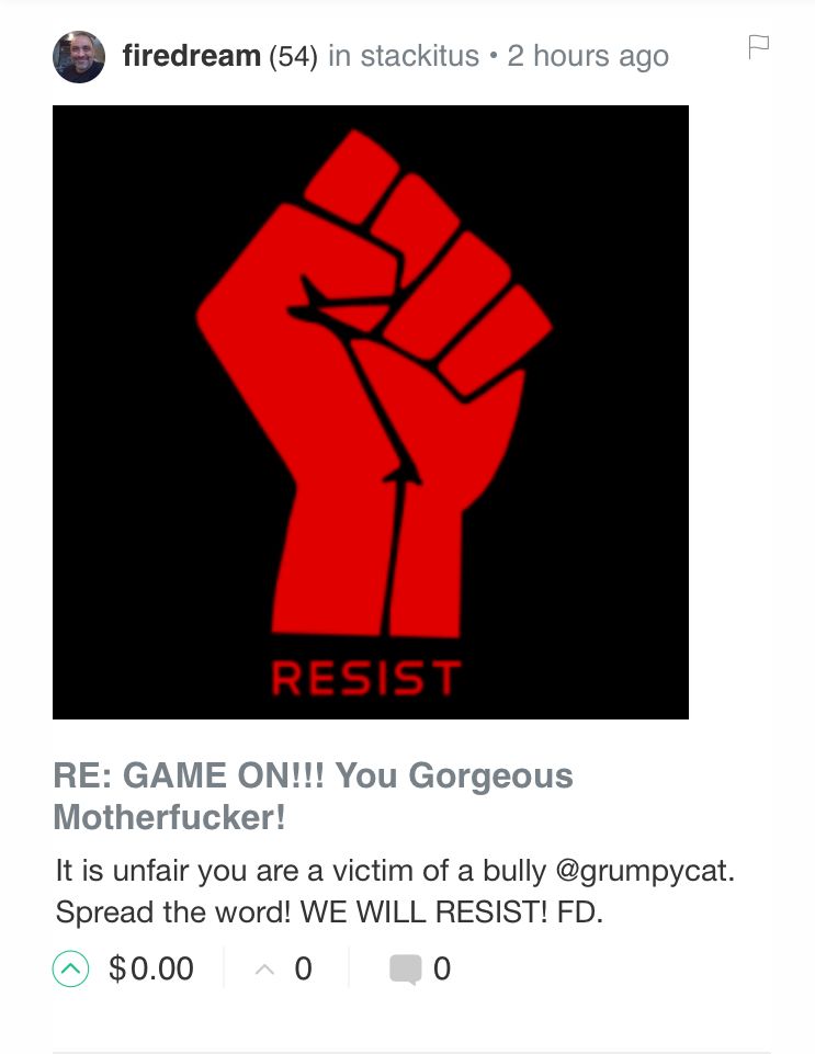 The gimp-cat downvoted me, yet again, for using a bot — that he himself uses — and is complaining that people are upvoting old posts. The post in question was mere hours old. Here is a very rich individual who is trying to dictate how this platform should be utilized —-> by using “@grupycat” compliant bots. If this is not the ugly insertion of his own deranged facism then it is something worse.