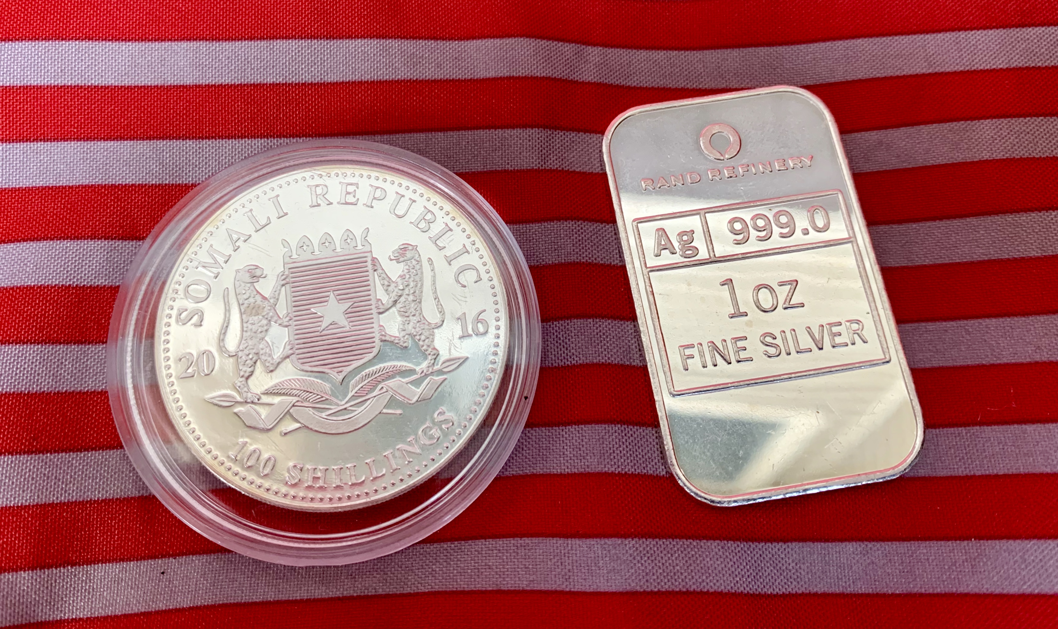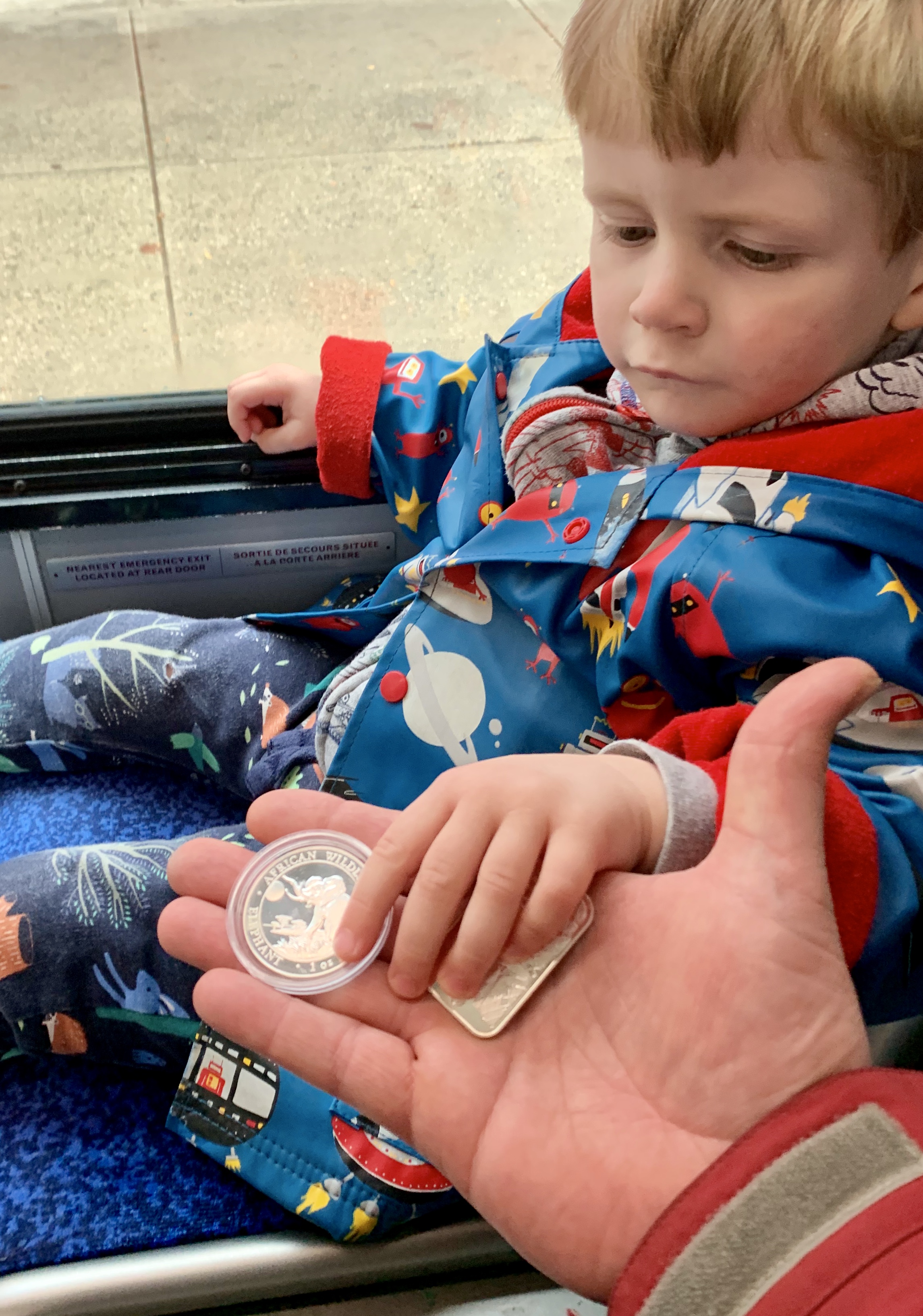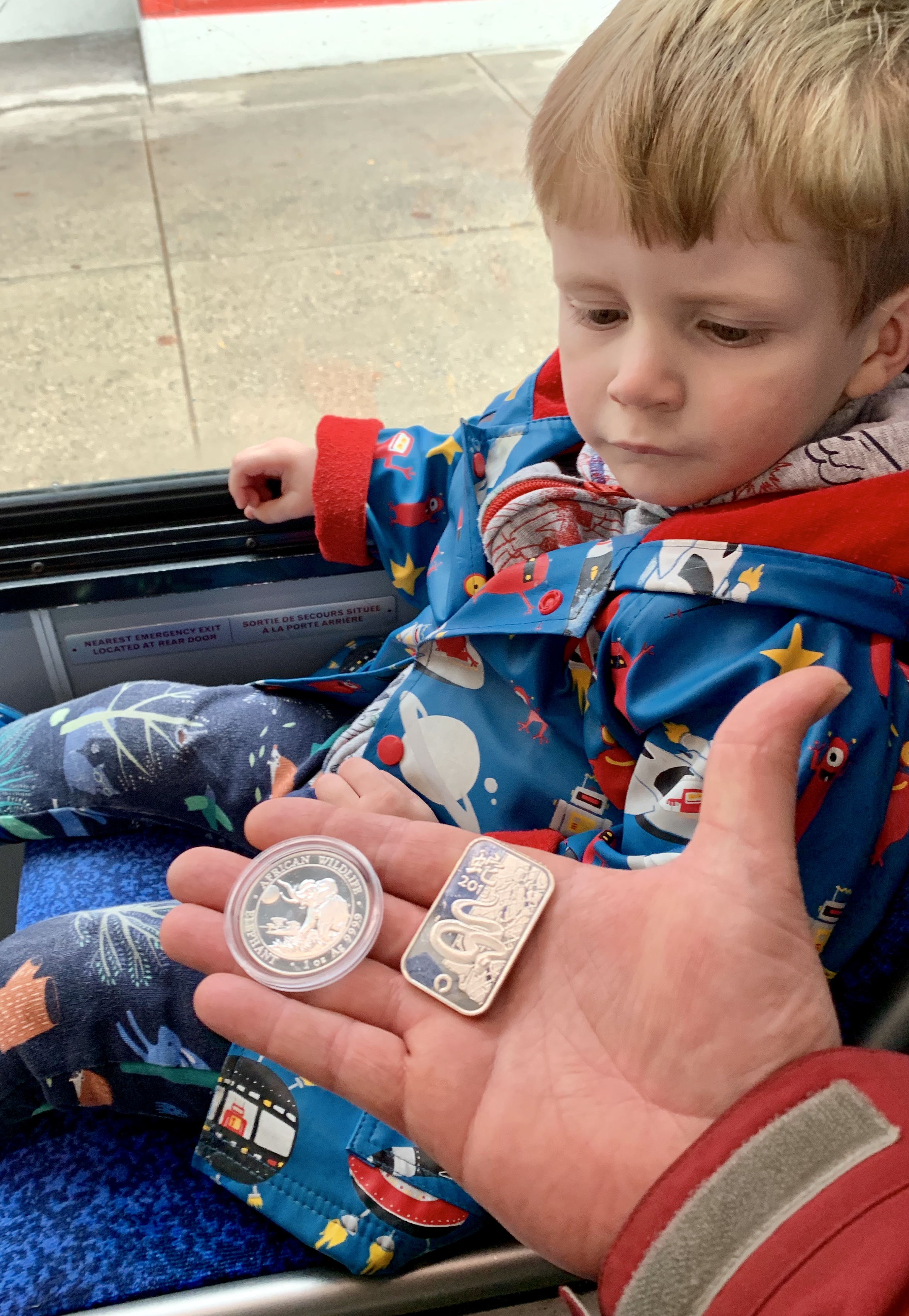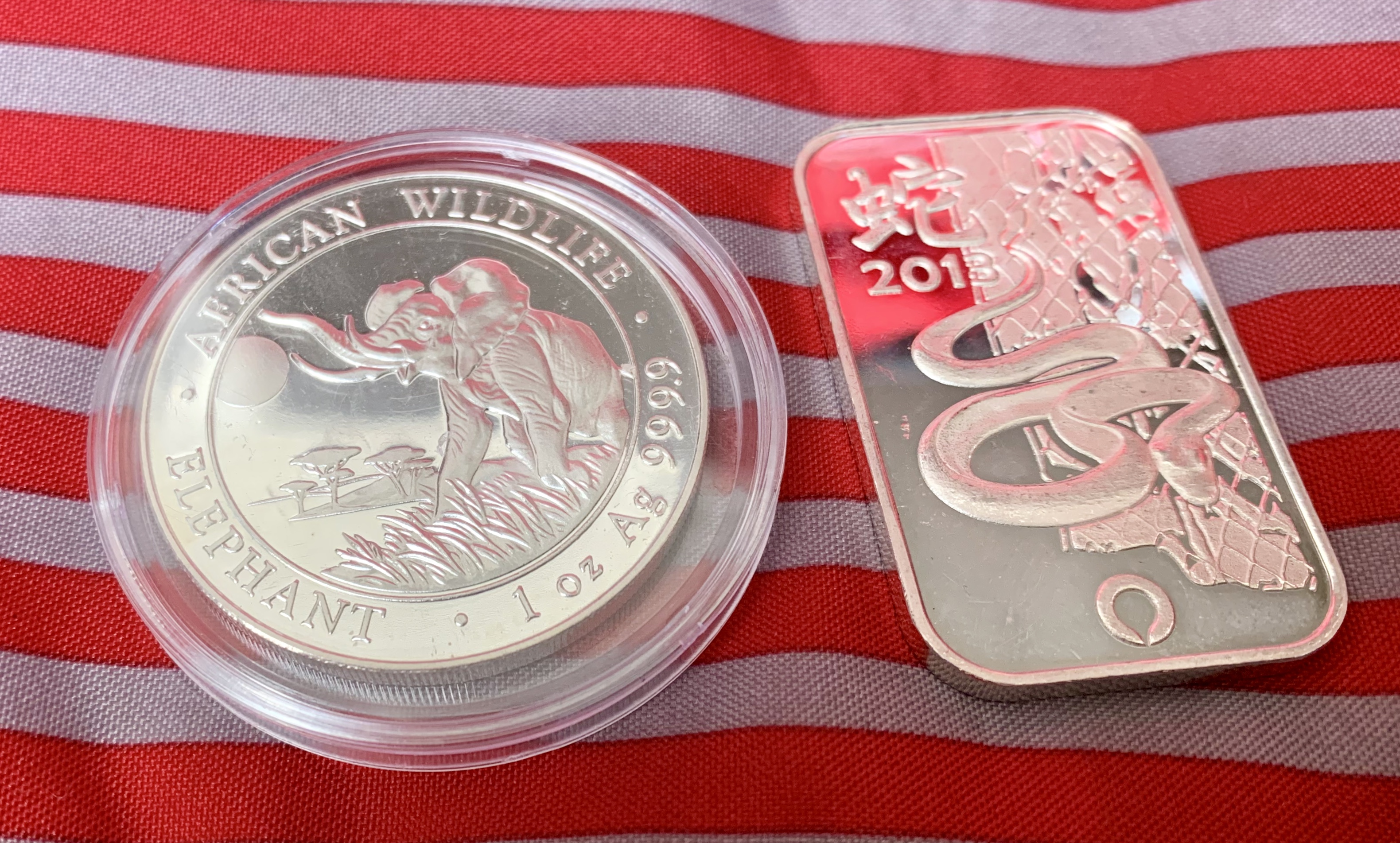 Avast! The young scallywag know’s when a good score has been made. We got a 2016 Somali Elephant and a 2013 Snake bar from Rand mint — and again, got them for generic price (about $1.40 cheaper than a Maple!)