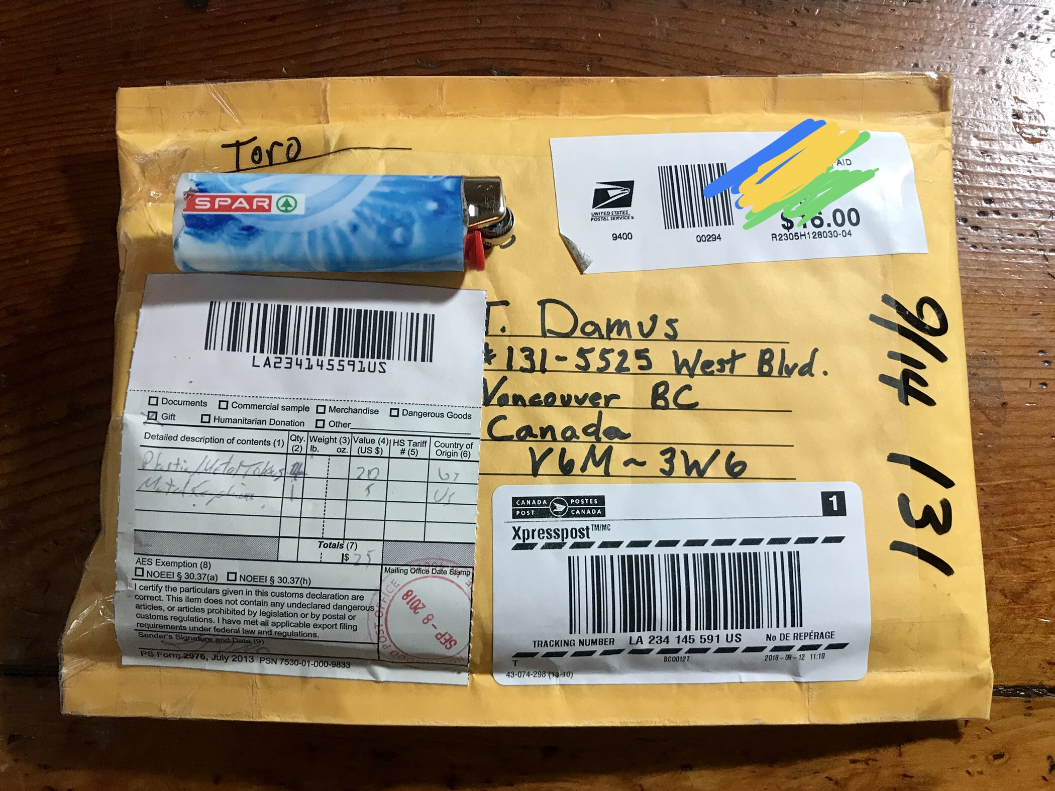 Oooh la la, it’s already looking pretty interesting! I see some cash and a postcard, and this package has balls! It cost $16 freakin’ bucks to send — Thanks Toro!