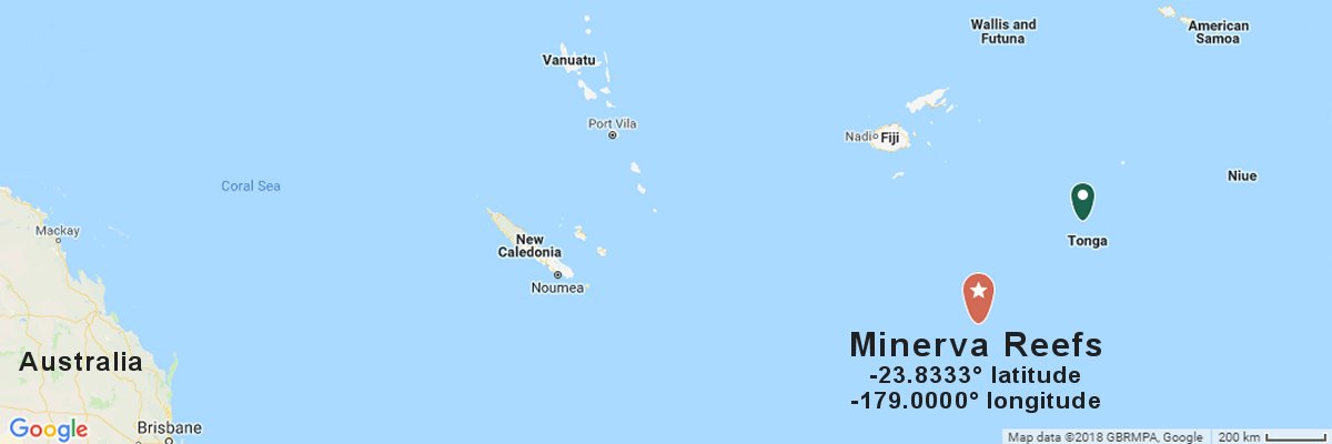 Being interested in geography my entire life, of course, I wanted to see this place on a map! Fortunately, AtlasObscura.com provided a map with the location marked. I modified it slightly to add the name of the place and the latitude and longitude beneath. The red marker shows the location of the Minerva Reefs, and the green marker shows the location of Tonga, 250 nautical miles to the northeast.