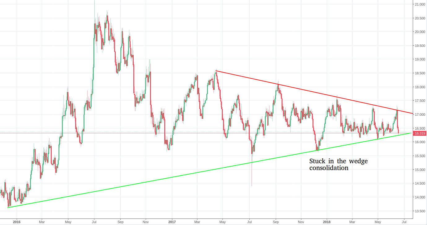 A further smash down today has failed to break the upward support line of the consolidating wedge. We can see that as the wedge narrows the volatility is increasing somewhat. I expect that we might see a bounce tomorrow as the price hits the support line and some buyers move in.