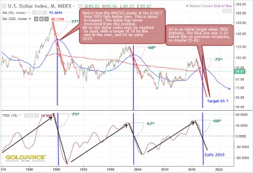 To finish off with, I’ve taken a closer look at the dollar chart, and applied some lessons from the past to see where we’re likely to be going. Fascinating to see how the moving averages behave at the dollar top and how our current position compares to the last 2 dollar cycles. Our timing in the cycle is perfect, the moving averages and TRIX are about to confirm beyond any reasonable doubt that the dollar is in a bear market. Our angle of descent is similar to past occasions and if timings are similar, we should see TRIX bottom in early 2019, taking us to around 65 on the dollar index (where the red descending line finds itself at the TRIX low early next year), followed by choppy action and a final low of 55-60.