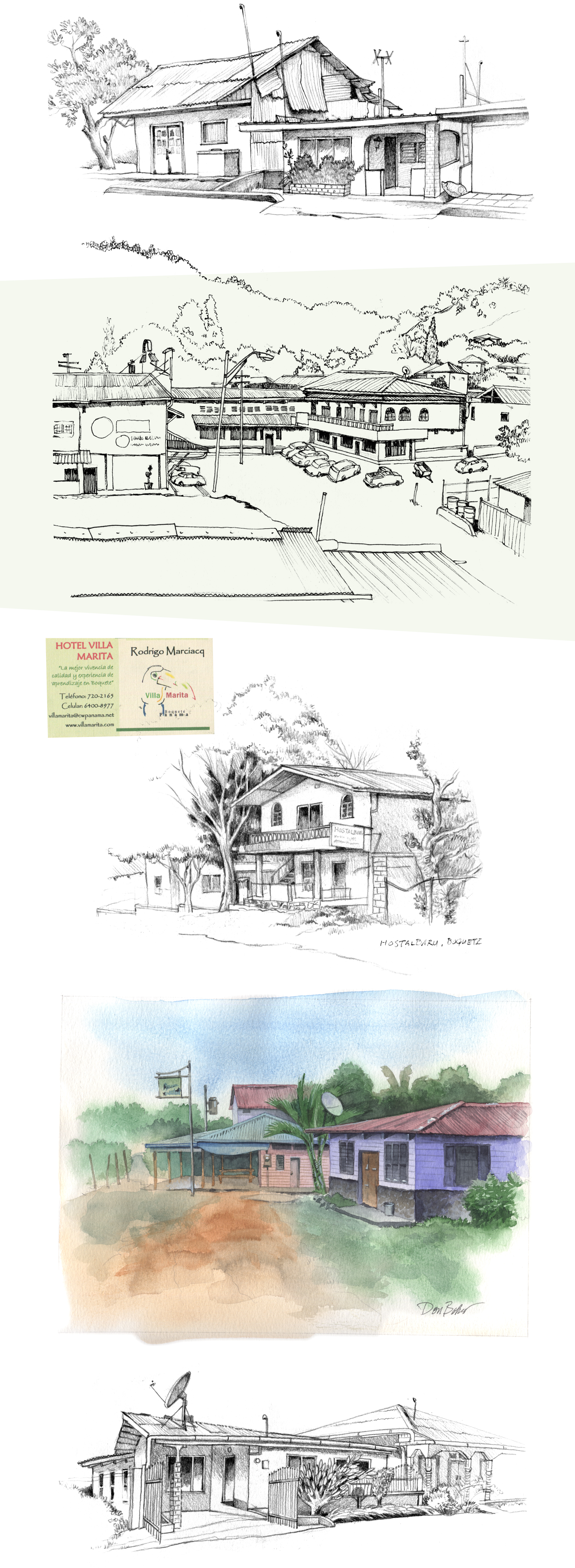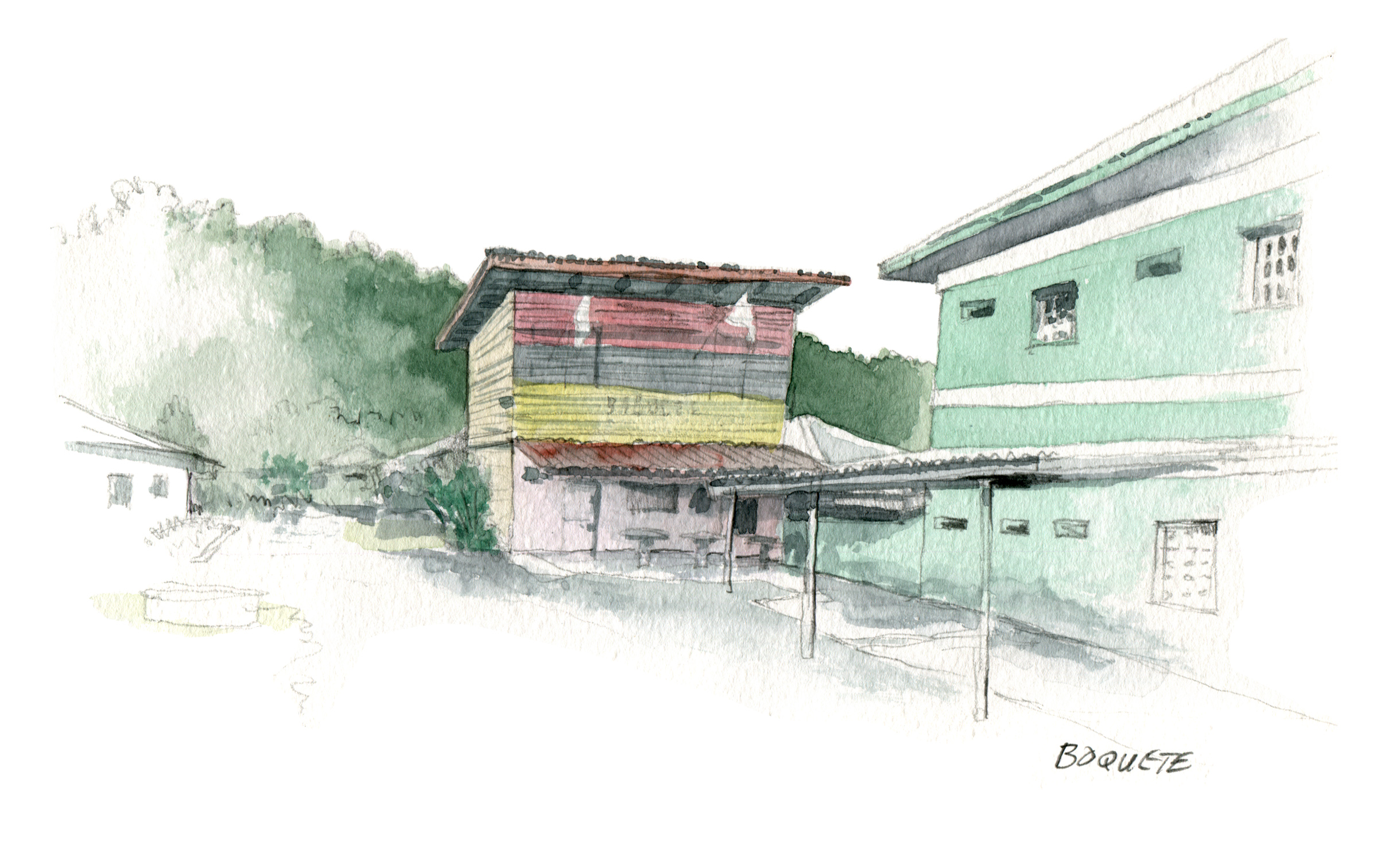 I did quite a few sketches of things, mostly of houses and buildings as usual. I did stay a few nights with my friends who had a great house on the hill overlooking Boquete, the mountains, and the Caldera River, where they caught a bit of a gentle breeze. My last day there, we watched the unfolding of the Fukushima tsunami devastation. A tsunami warning was given to all countries on the Pacific, and it so happened that it was due to arrive in Panama City just when my flight was to depart. Fortunately it was a non-event there.