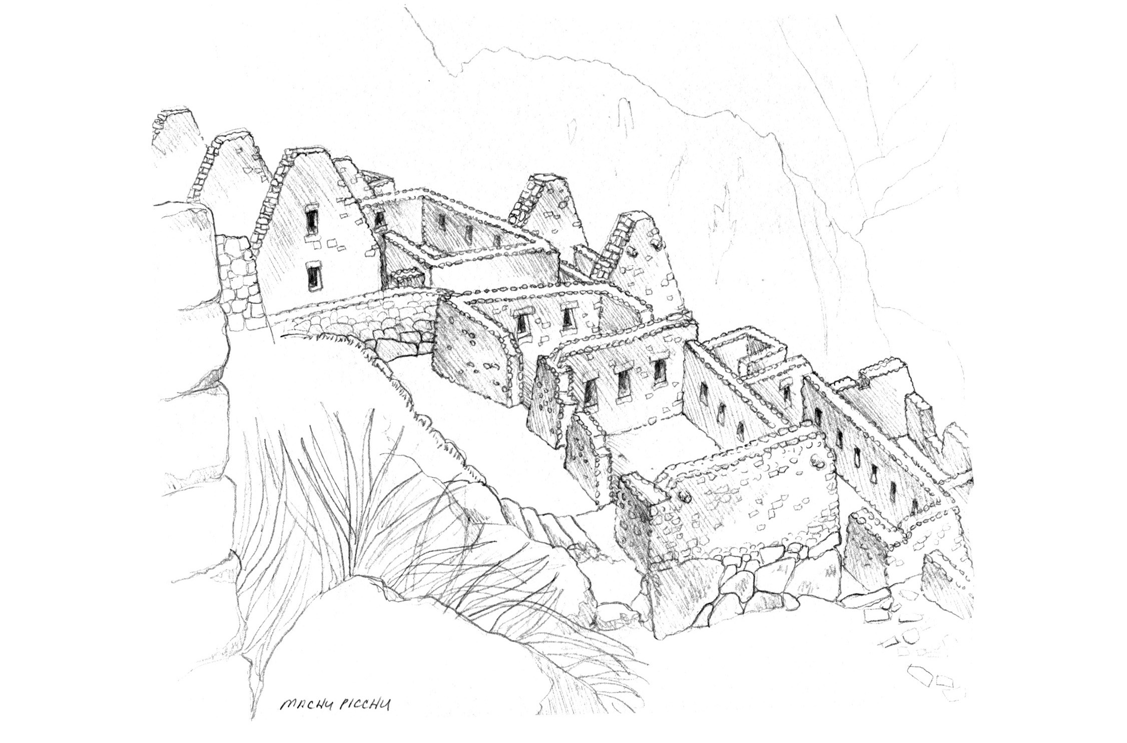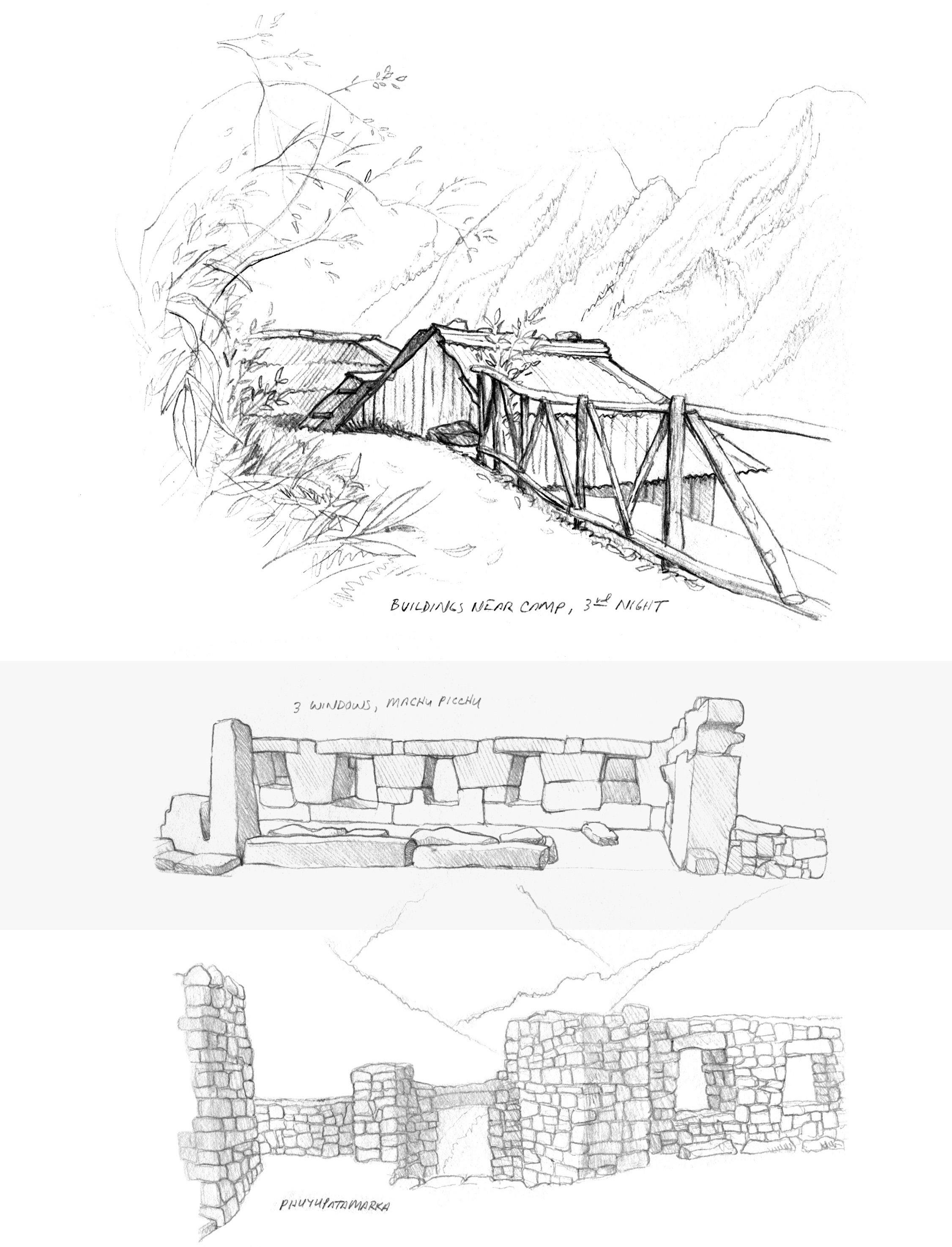 The trail was high up on steep mountains, and wove in and out through a number of fantastic ruins. It was a hard hike overall for me, so I didn’t have the energy to sketch much. On the 4th day, we hit the trail at 4am. As it got lighter we had amazing glimpses of the canyons and river way down below. And then finally we scrambled up the last set of slippery steep steps to the sungate, where all of Machu Picchu came into view. Luck was with us this morning because we were treated to clear views of it all. The day before had been completely clouded in.