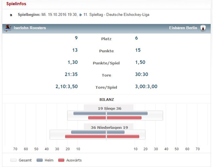 [German] Aufgrund des großen Interesses letztes Mal, habe ich mich dazu entschieden noch ein weiteres Deutsches Eishockey Spiel von dieser Saison auszusuchen. Am Mittwoch den 19.10.2016, 19:30 CET, werden die Iserlohn Roosters gegen die Eisbären Berlin spielen. Für die Iserlohn Roosters wird es ein Heimspiel und sie sind aktuell auf Platz 9 in der Liga-Tabelle. Die Eisbären Berlin sind jetzt nach dem Sieg gegen ERC Ingolstadt auf Platz 6.