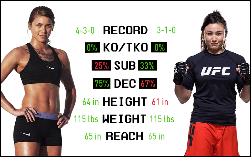 Her dominant wins and wars with former Invicta FC contenders like JJ Aldrich and Amy Montenegro have shown she can last the full 15 minutes of a fight at a hare's pace! Jamie's few glaring weaknesses do not lay with her mentality or fortitude; it is the intangibles of her lacking reach and height. Closing the distance should not be too hard for the powerful Moyle, but she surely has her hands full with one of the bigger girls she has ever faced.