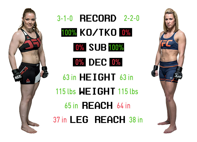 Amanda is an experienced veteran at this point with over 10 wins since 2011 (5 of those wins coming in amateur fights), she also has a boxing pedigree and a big right hand herself. Amanda is somewhat hittable and basic on the feet, but her grappling and takedowns from the clinch make her a threat as soon as she grabs the opponent. This is the second time we will see Amanda on the UFC's big stage, and as a growing prospect, we can expect to see new weapons in her arsenal.