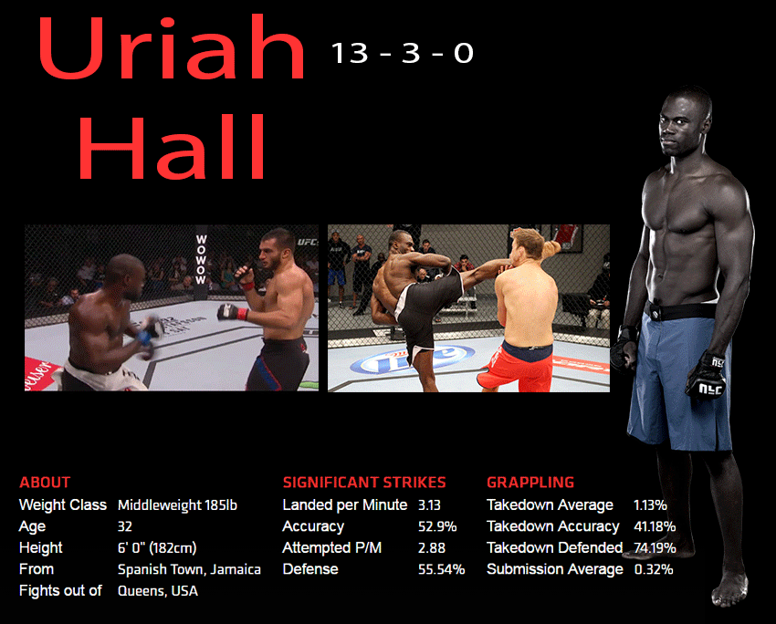 Uriah 'PrimeTime' Hall is a 2nd degree Kyokushin Kaikan black belt, and the 12th ranked Middleweight fighter in the 'UFC'. Kaikan is a form of full contact karate, and Uriah's training in that art form has made him and formidable and frightening striker. 'PrimeTime' is an imposing 6 foot with a broad frame and nearly 80-inch reach, his power is shown through impact...as he is devastating from range.
