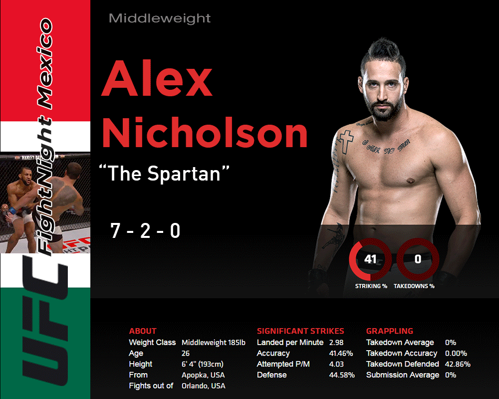 Alex Nicholson is somewhat new to the UFC as this is only his third fight in the Octagon. He displays the assets of a madman, taking on anyone at anytime and igniting true brawls in each one of his fights. Also, he took a fight against Misha Cirukov on a week's notice, one of the most dangerous men at a weight class above his own. He ended up having his jaw snapped that night, but Cirkunov was forced to take him down for the finish as Nicholson was too much for even that beast on the feet. Alex was almost set up to fail again when put against rising star Devin Clark in Clark's own backyard...he was a 4-1 underdog. Alex showed a weakness to getting taken down, but he was able to actively seek back-doors and find his way back to striking range. Clark had trouble holding down Nicholson, and the hellacious body kicks and straight punches from Alex sent Clark to the floor....he had succumb to blows as the first round bell rung. Nicholson is a terminator of a middleweight, he has finishes over men who now fight at heavyweight, and he has never won a fight on the cards. 7 wins, 7 finishes with 2 losses, one loss being to Cirkunov. Records do not mean much in MMA, but this is a man young to the sport who has shown much promise. Nicholson represents a new breed of fighter that represents the unorthodox nature of mixed martial arts, guys who throw themselves into chaos because they are unafraid. Nicholson will have to use that incredible chin and power to keep the smiling one at bay, whether he can do is a different question entirely.