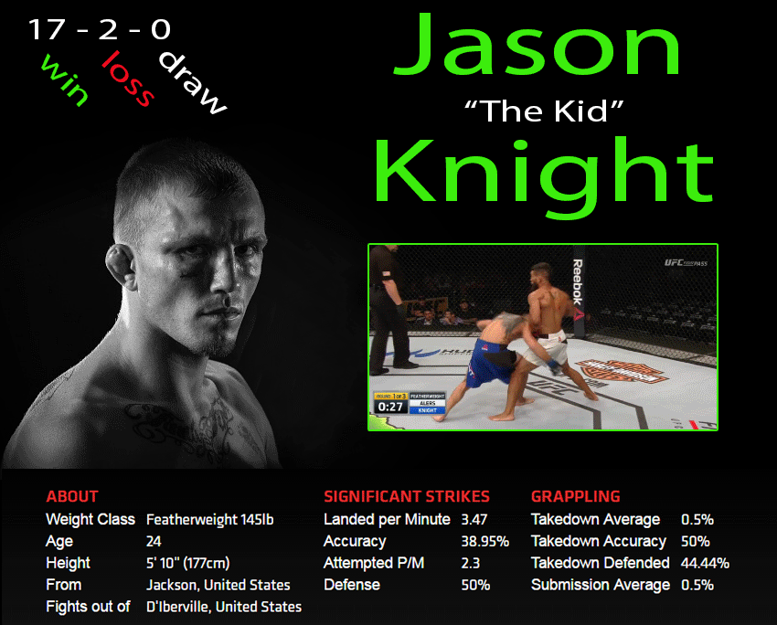 Jason 'The Kid' Knight is the Florida raised southern boy who is always down for a fun fight. He is making his third walk to the cage after an incredible fight of the night performance his last out against Jim Alers. The onslaught Knight brought with constant forward pressure and volume striking forced Alers to become a wrestler at most points in that fight..and Knight constantly sought submissions from his back and top position and forced the fight for 15 minutes.