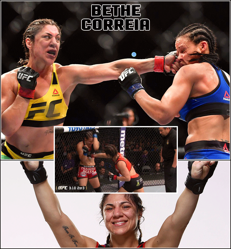 Correia has experienced a couple tough losses: Rousey finished her with heavy blows in the first round, Jessica Eye beat her by split decision in a fight many thought she won, she also was dropped and maimed badly (in the third round) by Marion Reneau in her last bout...her will to persevere through bad positions won her a draw with the judges but the fans saw a somewhat broken fighter. It will be on Bethe to train hard for her first five round fight; with her brawling style, I can see an excellently fun clash with both women engaging blows and never backing down