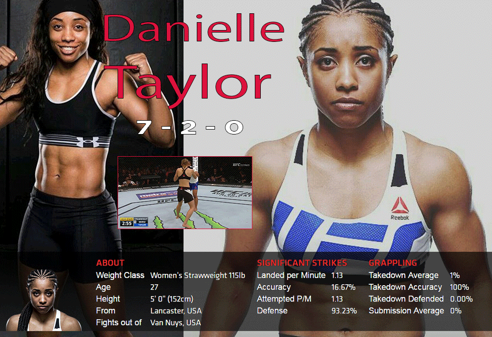 Danielle Taylor is a Saekson Muay Thai fighter making her 2nd appearance on the 'UFC' stage. Her bomb of a right hand is abnormal for a girl her size, and every opponent she has ever faced changes their gameplan completely when they get tagged once by the girl. Maryna Moroz who has submitted power strikers in the past struggled to maintain a good distance from Taylor who stalked her the entire fight.