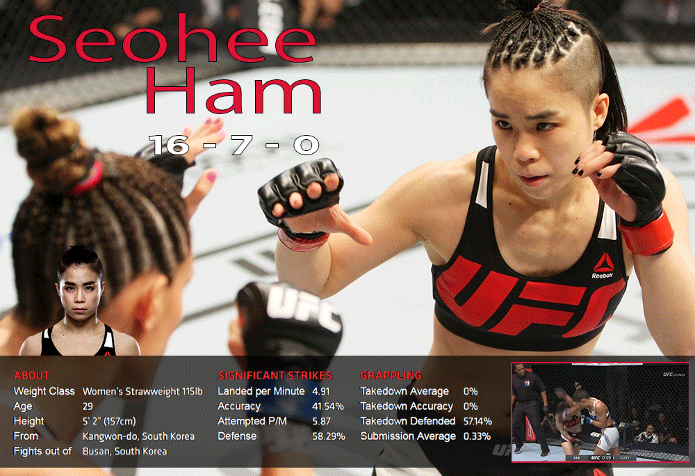 Seo Hee Ham is an explosive South Korean slugger who takes to her name 'Hamderlei' quite well. She resembles the legendary 'Axe Murderer' with her plod forward and bang style. She is unafraid to eat and dish heavy blows as she is one of the most durable we have ever seen in the cage. The brutal body blows, and sharp hits she took all through the Calderwood fight showed she has a strong mindset and ill in the Octagon.