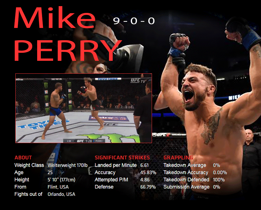 Perry is a dazzling 9-0 with all his finishes coming by way of strikes, he still holds 0 losses which can not be said for many fighters at this top level. Perry is a FINISHER, he throws overhands rights and lefts with everything he has, and for a man with his power and size...he has incredible energy and cardio deep into the 3rd round and beyond. His UFC debut was a blistering knockout of top 15 staple Hyun Gyu Lim, and he decimated Britain's top prospect Danny Roberts in the UK with a hellacious 2 and a half round beat down ending in a frightening knockout. He is a serious guy to watch at 170, and his aggressive style makes for fight of the night every time he arrives.