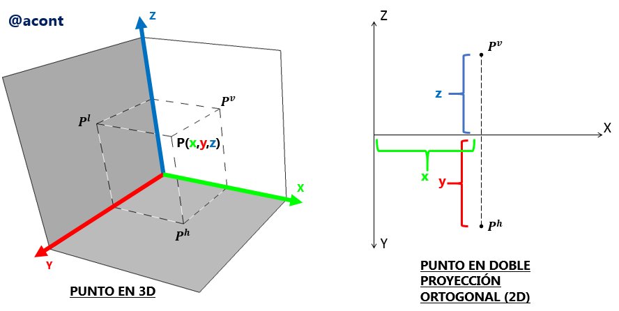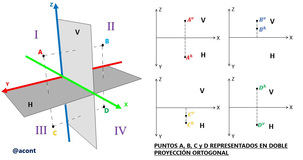 Según lo visto hasta ahora, para representar un punto ubicado en el espacio en el plano, solo necesitaríamos conocer sus coordenadas (X,Y,Z). Sin embargo, para el dibujo utilizaremos una nomenclatura específica, la cual consiste en utilizar letra mayúscula y un superíndice que indica la proyección de dicho punto sobre los planos horizontal y vertical de proyección.