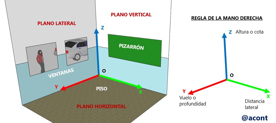Básicamente, tenemos tres planos de referencia (horizontal, vertical y lateral) los cuales poseen un origen “O” (punto de corte de los tres planos), y la intersección entre los mismos origina los ejes de coordenadas “X”, “Y” y “Z”. Posemos ilustrar lo anterior mediante el ejemplo de un aula de clases, donde cada pared representa cada uno de los planos de referencia (Figura N°2).