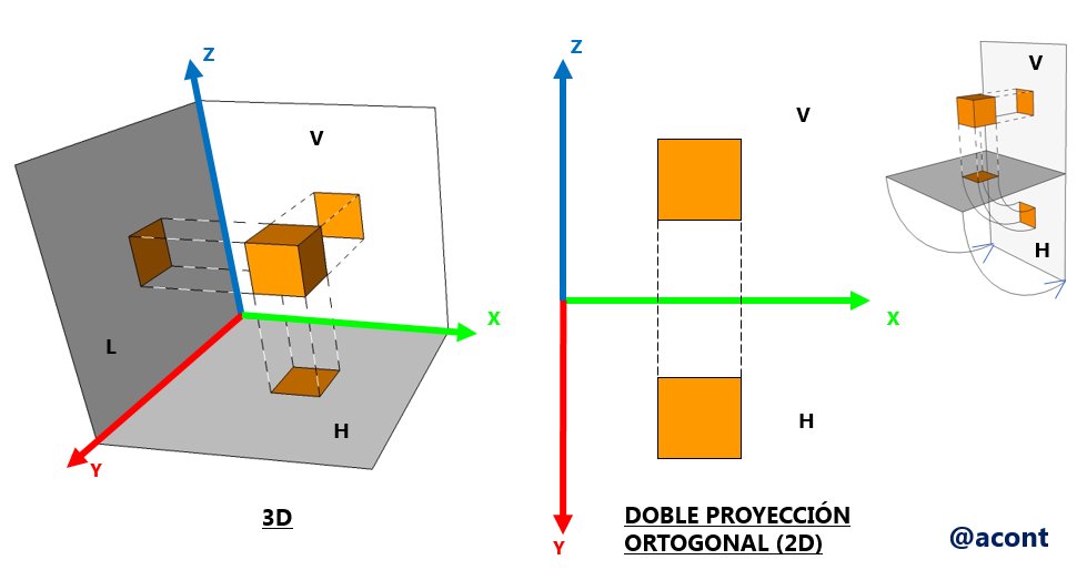 La ubicación de un objeto en alguno de estos cuatro cuadrantes determinará la forma en que el mismo será representado en el plano, puesto que ahora veremos la metodología utilizada para realizar esto: la doble proyección ortogonal. Esta es la esencia de la geometría descriptiva, puesto que es la forma en la que podemos describir un objeto tridimensional en el plano mediante lápiz, papel y los instrumentos de dibujo necesarios.