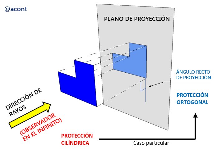 La proyección ortogonal es un caso particular de la proyección cilíndrica en la que los rayos de proyección forman un ángulo de 90° con el plano sobre el cual se proyectan (Osers et al 2010). Dicho de otra manera, un objeto en el espacio será representado a través de su proyección ortogonal sobre un plano de proyección, es decir, como si el observador de dicho objeto se encontrara en el infinito, tal como se observa en la Figura N°1.