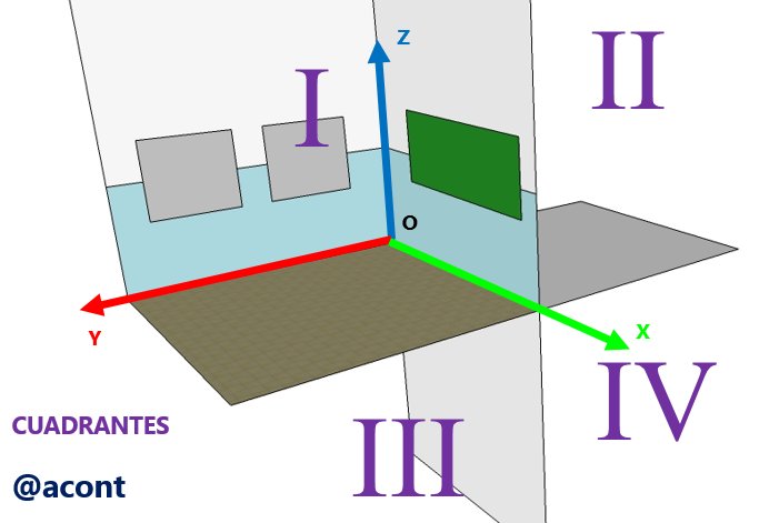 Para la orientación de los ejes utilizaremos la regla de la mano derecha tal como se observa en la Figura N°2. Al establecer tres planos y tres ejes de coordenadas, estamos a la vez generando ocho octantes o zonas dependiendo del signo de cada eje, sin embargo, usualmente solo nos vamos a referir a los cuatro cuadrantes ubicados a lo largo del eje “X” positivo. Estos cuatro cuadrantes se observan en la Figura N°3.