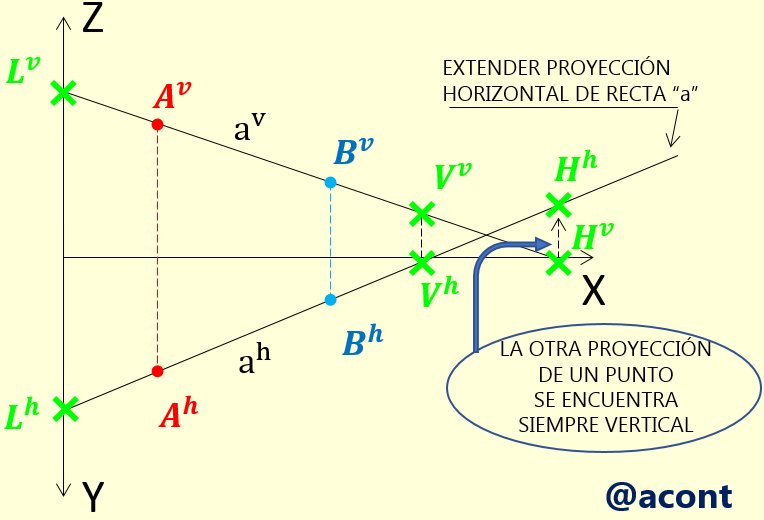 Debemos extender la proyección horizontal de la recta “a” por sobre el eje X, y luego trazamos una línea de referencia vertical que pase por la proyección conocida del punto H. Es importante no olvidar que ambas proyecciones de un punto (horizontal y vertical) siempre deben de estar sobre la misma línea de referencia (perpendicular al eje X), de lo contrario dicho punto posee proyecciones imposibles o carentes de sentido, ya que no coincidirían en el espacio.