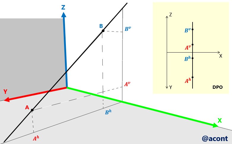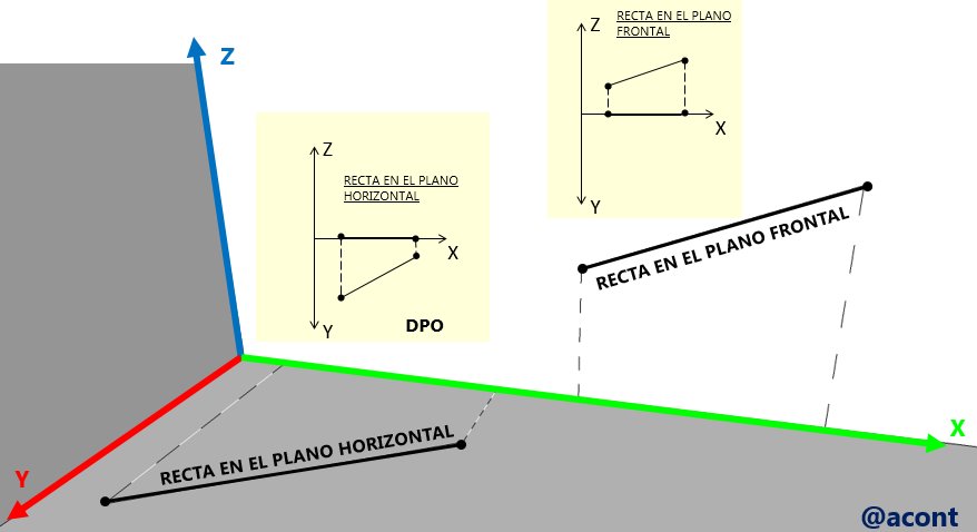 Saludos y bienvenidos. Anteriormente en la primera parte hablamos de la representación del punto en doble proyección ortogonal y de cómo a partir de dos puntos conocidos podemos trazar una recta en el espacio y representarla en doble proyección ortogonal (a partir de ahora doble proyección ortogonal=DPO) a través de sus proyecciones horizontal y vertical.