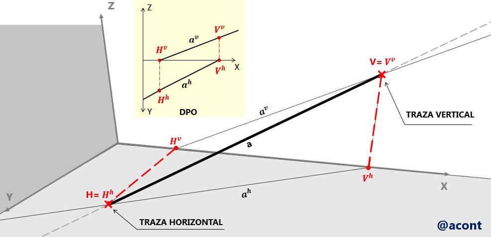 Las trazas de una recta corresponden simplemente al punto de corte de una recta con cada uno de los planos de proyección. La traza horizontal “H” es el punto de corte de una recta con el plano horizontal de proyección. Lo mismo para la traza vertical “V” con el plano vertical de proyección. En la DPO, el uso de estos dos puntos es importante en ciertos procedimientos, por lo que se debe tener claro que representan las trazas de una recta y como ubicarlas. En el artículo anterior se abordó la representación de las trazas “H”, “V” y ”L” de una recta dada. La traza lateral ”L” no suele utilizarse en la DPO. Para ubicar las trazas de una recta “a” en la DPO, se debe ubicar el punto donde cada proyección de la recta corta con la línea de tierra (eje X).