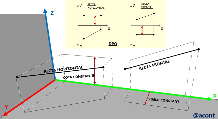 Estos tipos de rectas poseen una propiedad importante: en el caso de la recta horizontal, todos sus puntos poseen una cota constante; y en el caso de la recta frontal todos los puntos sobre ella poseen un vuelo constante. Es indispensable para el estudiante familiarizarse con los términos vuelo y cota. En la Figura N°3 observamos la situación en tres dimensiones y también representada en la DPO.