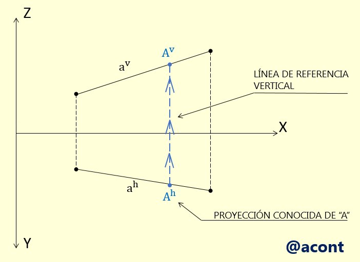 En el caso de una recta cualquiera representada en la DPO, cuyas proyecciones horizontal y vertical son conocidas, si se quiere hallar la proyección desconocida de un punto sobre esta recta conocida la restante, simplemente se traza una línea de referencia vertical hasta cortar la otra proyección de la recta (Figura N°2). Lógicamente, si un punto se encuentra sobre una recta en el espacio, en la DPO las proyecciones de dicho punto también estarán sobre las proyecciones de dicha recta.