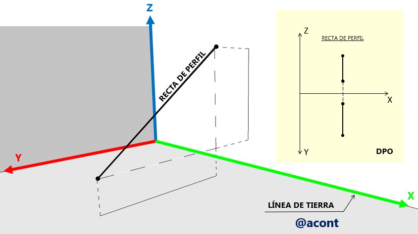 De esta manera hemos ubicado la recta de perfil en el plano vertical de proyección. En la DPO podemos observar claramente la recta de perfil representada sobre el plano vertical, de esta manera podemos apreciar su inclinación. No obstante, no debemos olvidar que esta no es la ubicación real de esta recta sino más bien una vista de la misma desde el plano lateral.