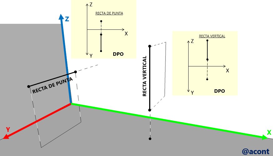 La recta de punta es paralela al eje Y, cuando se representa en la DPO, su proyección sobre el plano vertical será tan solo un punto, mientras que será totalmente vertical su proyección horizontal. La recta vertical es lo contrario, su proyección horizontal en la DPO es tan solo un punto. Podemos ilustrar claramente esto en la Figura N°5.